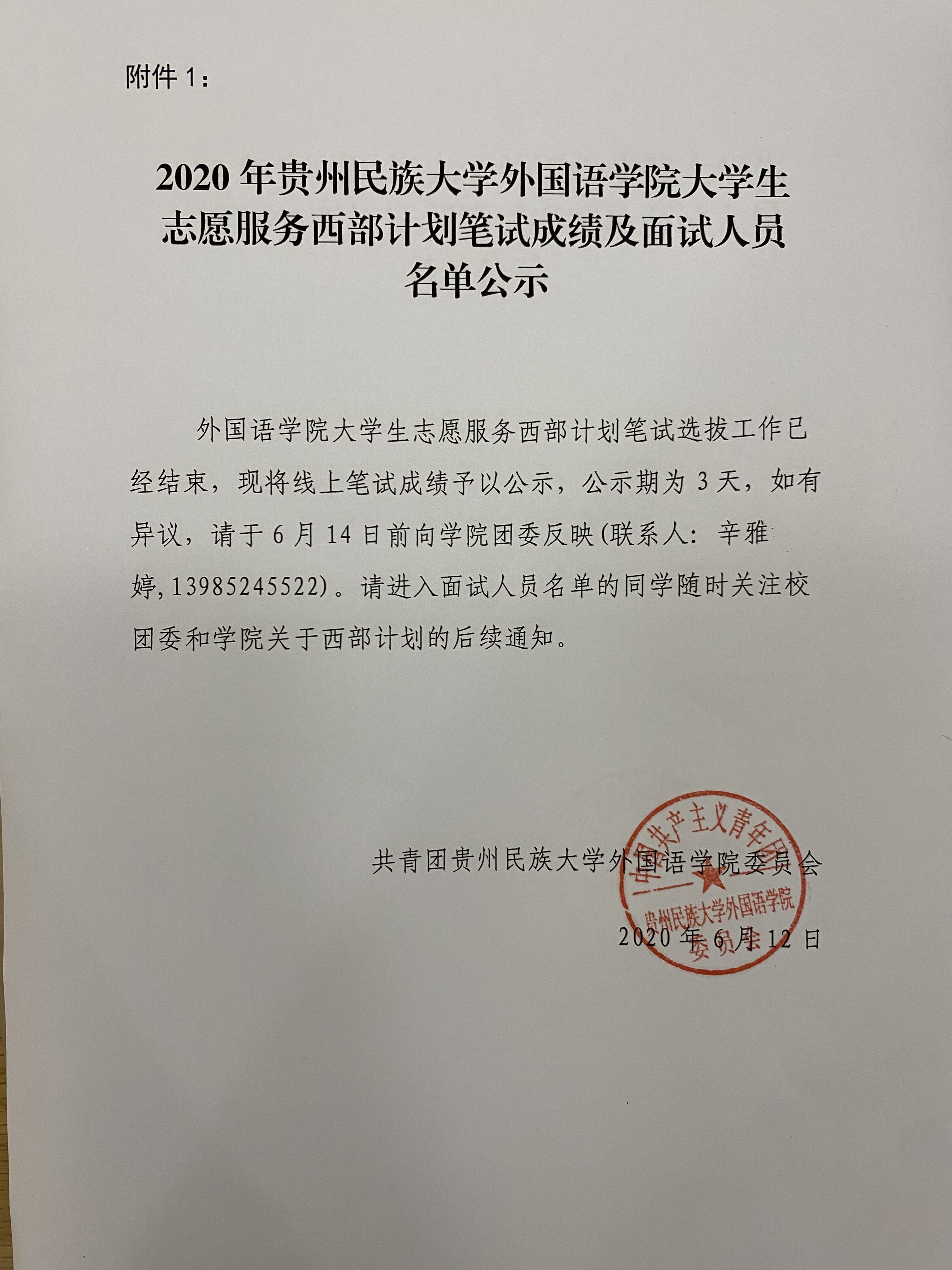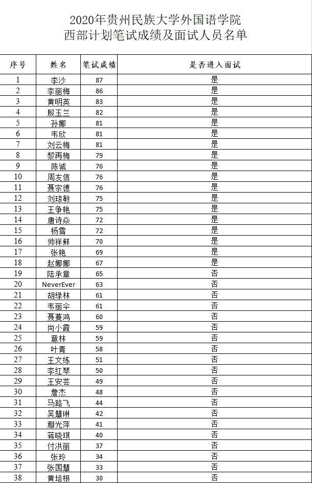 2020年437必赢国际线路大学生志愿服务西部计划笔试成绩及面试人员名单公示
