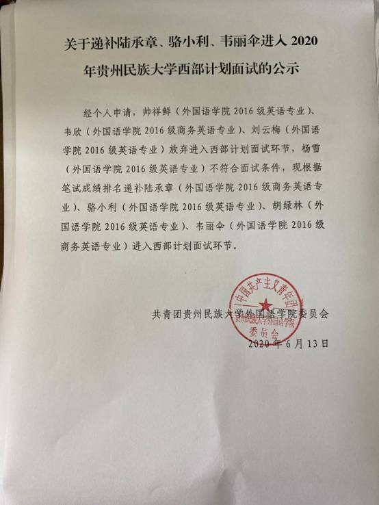 关于递补陆承章、骆小利、韦丽伞进入2020年437必赢国际线路西部计划面试的公示