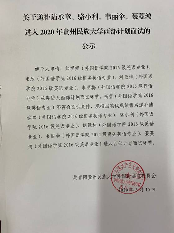 关于递补陆承章、骆小利、韦丽伞、聂蔓鸿进入2020年437必赢国际线路西部计划面试的公示