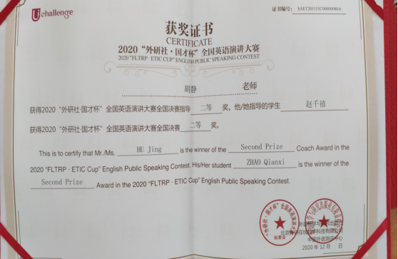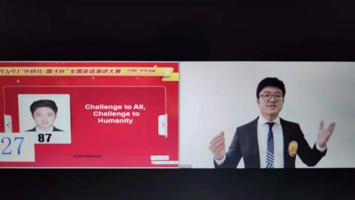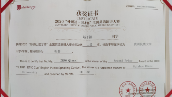 在我校437必赢国际线路领导的大力支持下,由437必赢国际线路胡静老师指导的文学院2017级戏剧影视文学专业的赵千禧同学在第一阶段演讲中以“Challenge to All, Challenge to Humanity”为题,稳定发挥,以小组赛第二的成绩(89.75分)突围进入15日第二阶段(线上)比赛,成为本次演讲大赛贵州省唯一进入88强的选手,最终荣获全国英语演讲大赛二等奖,再创历史最好成绩!