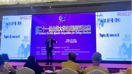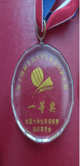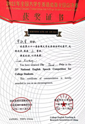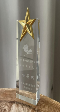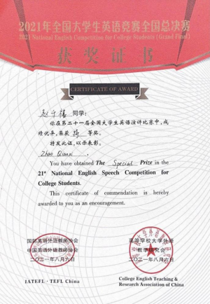 赵千禧同学通过层层选拔,数百名进入总决赛的全国优秀选手中脱颖而出,“第二十一届全国大学生英语演讲比赛”摘得桂冠,以第一名的傲人成绩获特等奖!为学校争得荣誉