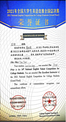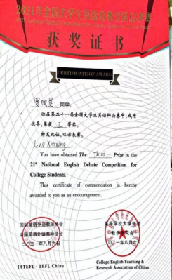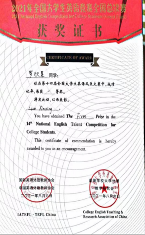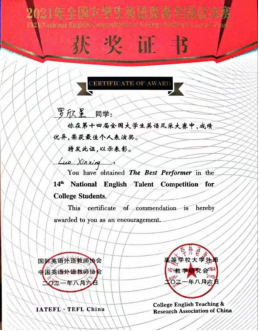 此外,我校入围总决赛的罗欣星同学在田甜老师的指导下表现也很优秀,荣获“第十四届全国大学生英语风采大赛等奖和最佳个人表演奖,她在“第二十一届全国大学生英语演讲比赛”“第二十一届全国大学生英语辩论中分获三等奖!取得不俗成绩。