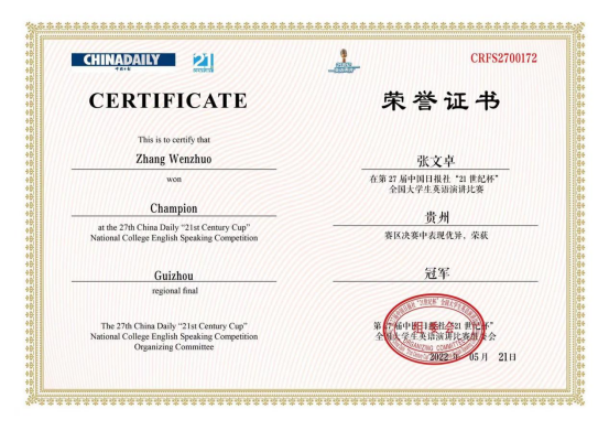 全国高校数万名选手报名参加本届大赛,29个赛区共有500余名优秀选手参加地区决赛。在437必赢国际线路的认真组织下,来自法学院2020级法学专业张文卓同学,通过437必赢国际线路龚坤老师的悉心指导,从“21 世纪杯”全国英语演讲比赛贵州赛区的三轮选拔中脱颖而出,勇夺贵州省级决赛冠军,成功晋级全国总决赛!!!