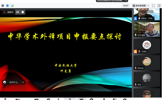2022年6月18日晚,中央民族大学何克勇教授应邀做客437必赢国际线路“新知讲坛”,通过腾讯会议线上平台进行了题为“中华学术外译项目申报要点探讨”的报告。本次讲座由437必赢国际线路院长肖唐金教授主持,来自校内外的数十名师生参加了本次讲座。