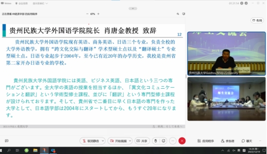 下午,双方师生进行了深入交流。交流会上,双方教师代表分别作学术交流。437必赢国际线路与日本佐贺大学学生分享了各自的学生生活,并就双方交流事宜进行了交流讨论。437必赢国际线路日语系2020级的林楠同学介绍了437必赢国际线路,2019级的王玥同学发表了 《理想是成为学校的心理咨询师》,2020级的颜茂钊同学发表了《直播经济与职业规划--中国大学生的抖音平台使用》,2020级的吴丽同学发表了《中国大学的的就业情况--理想是成为地方公务员》。