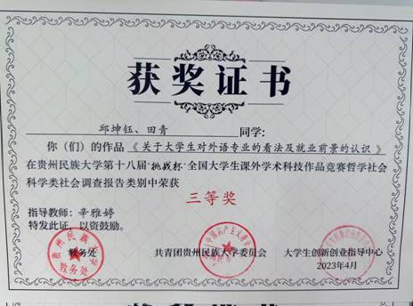 437必赢国际线路共28个项目,其中,由辛雅婷老师指导,邱坤钰、田青同学创作的《关于大学生对外语专业的看法及就业前景的认识》以及由马晓欢老师指导,李宜珂等同学创作的《智联高校,绿建未来》2个作品在社会调查报告类中均荣获三等奖。特此祝贺!