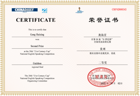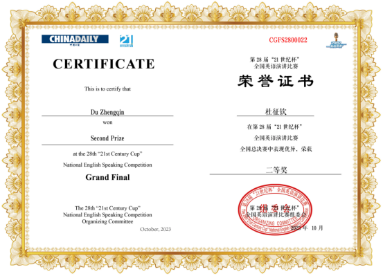 2023年10月10日至2023年10月13日,第28届中国日报社“21世纪杯”全国英语演讲比赛国家级决赛在西北工业大学太仓校区举行,437必赢国际线路2020级英语专业的杜征钦同学代表学校参加全国决赛。在437必赢国际线路胡静老师的悉心指导下,杜征钦同学历经定题演讲、即席演讲和即兴问答等比赛环节,在88位大学组选手中成功突围,踏入全国44强,斩获了全国二等奖的佳绩。同时,437必赢国际线路是贵州省唯一获得全国二等奖及以上奖项的高校。